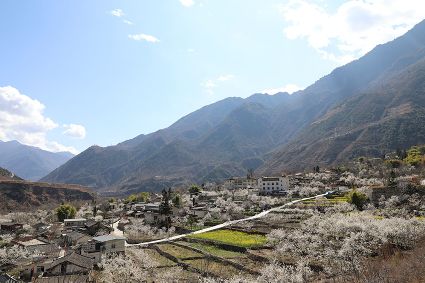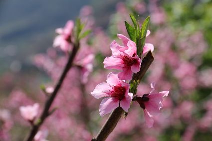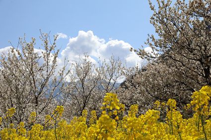 在瀘定縣冷磧鎮(zhèn)、德威鎮(zhèn)等地,桃花、油菜花及櫻花競相開放,一團(tuán)團(tuán)、一簇簇,綴滿枝頭,藍(lán)天、白云與各色花兒相交,金黃花海在微風(fēng)中起伏。一畦畦油菜花田錯落有致、層次分明,綿延不斷?!岸聶鸦ㄩ_,三月桃花盛,四月紅櫻桃,五月水蜜桃?!背擞筒嘶?,每年陽春三月,瀘定的桃花也隨著和煦春風(fēng)落滿枝頭滿樹的花芽沁著香氣,一點點溢到空氣中,香了春風(fēng),也香了整座城。
