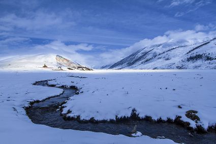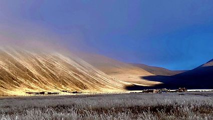 季春初始,濃霧夾帶著高原的寒風(fēng),彌漫在這片純凈素簡的大地上。朦朧中,紛紛揚(yáng)揚(yáng)的春雪,落在山峰,落在河谷,落在屋檐,落在林間,頃刻間就給萬物披上了銀白色的春裝。山麓、河谷、村落被白色潤染,像是喚醒一簾純白的甜蜜美夢;枯樹、春花、牧草被水汽滋潤,像是撫慰一冬的孤獨清寂。
