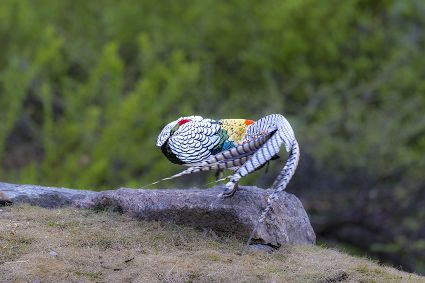 4月16日,筆者在康定市雅拉鄉(xiāng)境內(nèi),再次拍攝到國(guó)家二級(jí)保護(hù)動(dòng)物白腹錦雞求偶的清晰視頻。一只色彩斑斕的雄鳥(niǎo),拖著黑白相間的云狀斑紋尾羽,圍著雌鳥(niǎo)跳起了“圓舞曲”。整個(gè)求偶過(guò)程有十多分鐘。每年三至五月是白腹錦雞求偶期。