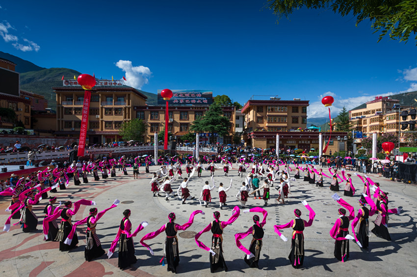 金弦子廣場,舞者們仿若守護(hù)者一般,圍著金黃色的弦子雕塑,或輕歌曼舞或昂揚踏步,斑斕的畢旺、搖曳的流蘇和飄逸的紅袖與花共舞,與景相映,聲聲吟唱、步步踏尋,是追憶更是誓言。