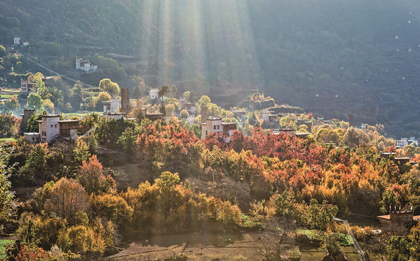 四季更迭,中路藏寨的魅力各異。秋天,正是藏寨最為絢爛的季節(jié)。造型獨(dú)特、別致的藏式民居,蜿蜒曲折的林間小道,組成了一幅美不勝收的畫(huà)卷。藏寨依山勢(shì)迤邐連綿,分布在相對(duì)高差近千米的山坡上,藏式樓房灑落在五彩斑斕的彩林中,與山谷、溪流、雪峰交相輝映,極富層次,構(gòu)成了一幅恬靜如詩(shī)的優(yōu)美畫(huà)卷。