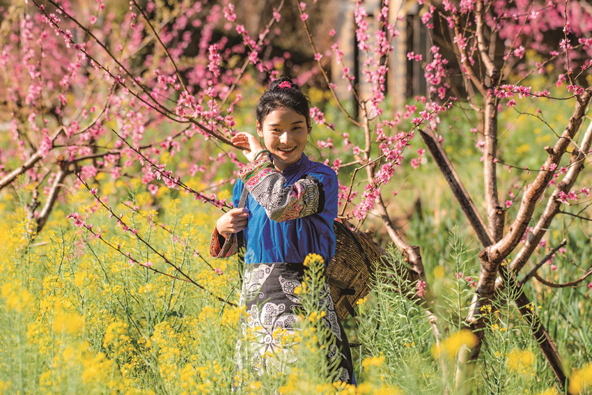 陽春三月,驅(qū)車百里,峰回路轉(zhuǎn),至一小鎮(zhèn),喚烏拉溪,為古驛站。背夫崖下,峻山環(huán)護(hù),小河繞村,屋舍散落,白墻灰瓦,綴以紅檐,桃花夭夭,棧道蜿蜒??图倚∨嘁聥扇?,穿行花間,簪花比俏。昔日荒坡,綠樹成蔭,繁花之下,草莓豆莢,青果胡豆,蔓草芳苓。
