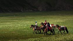 8月的扎溪卡草原水草豐美、牛羊遍地、到處是一片花的海洋,兩萬多平方公里的廣袤大地如同一座敞開的大花園。汽車行駛在草原上,就像一只小船在無邊無際的大海上航行,有時(shí)候覺得已走到了天邊,可是登高一望,還是芳草碧連天,地平線依然很遙遠(yuǎn),好像永遠(yuǎn)沒有盡頭。在這離藍(lán)天很近離塵世很遠(yuǎn)的廣闊空間里,仿佛在夢游仙境,周圍的山川景物都帶有夢幻般的色彩,對自身的存在也產(chǎn)生一種不真實(shí)的虛幻感。在這里,你似乎已變成了一個自由自在的牧人,只不過你放牧的不是牛羊,而是生命和靈魂。 扎溪卡草原的夏天到處呈現(xiàn)出一派生機(jī)勃勃的盎然景象,所有的生命之花都在這個季節(jié)盡情地綻放、茁壯地成長。在這個被稱為動物天堂的地方,你仿佛走進(jìn)了一個天然野生動物園,所到之處,不時(shí)有“羽族炫翎,蹄類競走”的情形出現(xiàn)在身旁。你會驚喜地看到一對對黑頸鶴在水邊起舞,一群群白唇鹿在山間奔跑,敏捷的巖羊在峭壁上跳躍,矯健的金雕在藍(lán)天上翱翔……