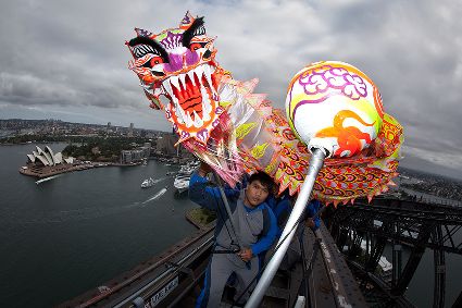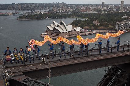 當(dāng)日,由當(dāng)?shù)厝A人團(tuán)體精心準(zhǔn)備的中國傳統(tǒng)舞龍亮相悉尼海港大橋,拉開中國新年慶?;顒拥男蚰弧?/span>