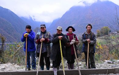 5、瀘定縣磨西鎮(zhèn)柏楊樹村的村民修路間隙。一直以來,這里的村民進村的路都是彎來繞去一下雨就坑坑洼洼的土路。村民說,明年春節(jié),他們出村的10余公里水泥路就通了。