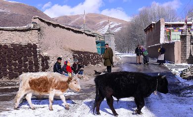 8、甘孜縣城郊雪山下的也哈村,雪后初睛,村民們在墻角曬太陽,生活悠然而恬靜。