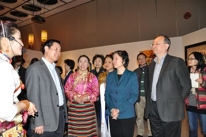 穆黎代表甘孜州婦聯(lián)向劉奇葆獻上藏繡哈達。
