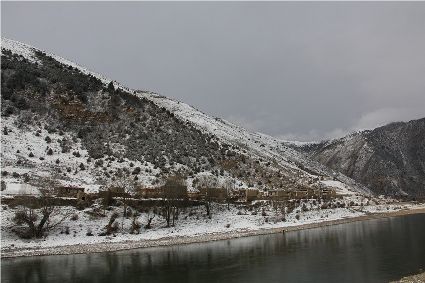 在接下來(lái)的路途中,停車休息的瞬間,一個(gè)臨水的村莊出現(xiàn)了。經(jīng)過(guò)昨夜的一場(chǎng)大雪,整個(gè)村子出人意料的“安靜”,河對(duì)岸牧民放馬的聲音,那個(gè)到河邊放下水桶汲水的女人取水的動(dòng)靜,似乎都被一場(chǎng)雪過(guò)濾了。我即使走到河邊,也難以通過(guò)耳朵和眼睛接近這一切。一幅無(wú)聲的畫面更貼近一場(chǎng)雪。我放下手中的相機(jī),似乎也在放下一些多余的東西,尊重著一種留白。