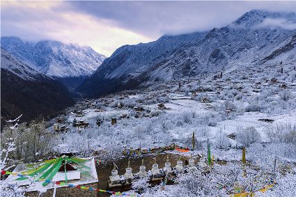 突然,耳畔傳來了誦經(jīng)聲。山坡下的平臺上,是一排白塔。白塔的周圍,掛滿了經(jīng)幡。早起的誦經(jīng)人,沿著中路藏寨的小路來到白塔,一邊轉(zhuǎn)白塔,一邊虔誠誦經(jīng)。一年四季的地區(qū)稱春雨貴如油,那么旱雨兩季的地區(qū)該怎么贊美春雪呢?怕是該稱為春雪貴如金了。祈愿吧——一年好時(shí)節(jié),又是一個(gè)豐收年!