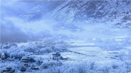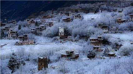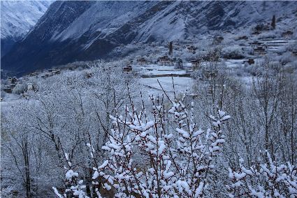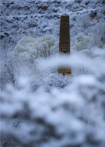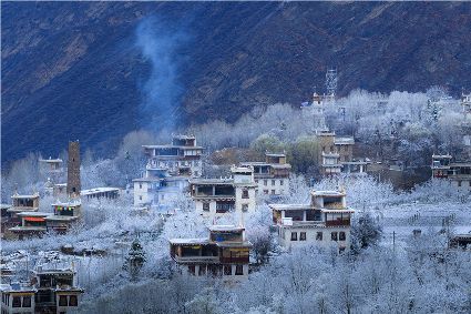 我以這份孤獨(dú)和執(zhí)著,爬上了東邊的山坡。雪停了,微風(fēng)習(xí)習(xí)。櫻桃花、桃花在雪枝頭冷艷,淡淡的幽香徐徐浸入心扉。滿眼望去,一片晶瑩,一片潔白。古碉藏寨在這片世界里,寧靜安詳,不容一絲一毫的驚擾。我懷疑自己進(jìn)入了那種叫做空靈的境界。