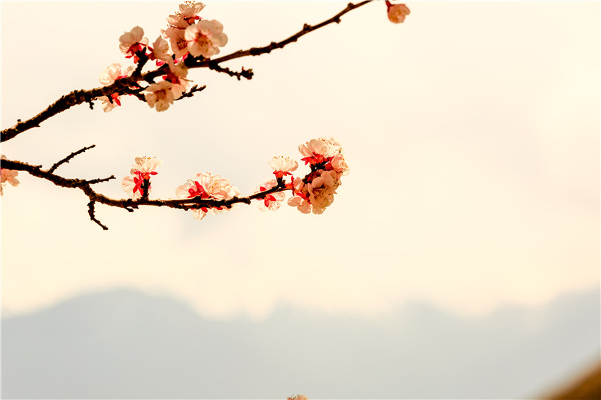 桃花綻滿枝頭,日當(dāng)村青山隱隱,