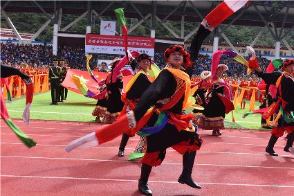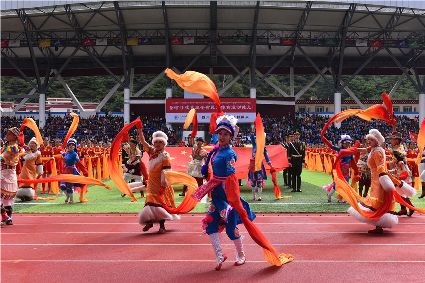 “本屆少數(shù)民族傳統(tǒng)體育運(yùn)動(dòng)會(huì)的會(huì)徽以格薩爾王賽馬登位為基本形象,由字母‘SC’組成的騎手代表‘四川’,數(shù)字‘15’組成了昂揚(yáng)奔騰的‘馬’為主體的形象,代表‘15屆民運(yùn)會(huì)’。這既有藏民族特色,又顯得美觀大方?!痹陂_(kāi)幕式現(xiàn)場(chǎng),來(lái)自杭州的陳琳興致勃勃地說(shuō)。