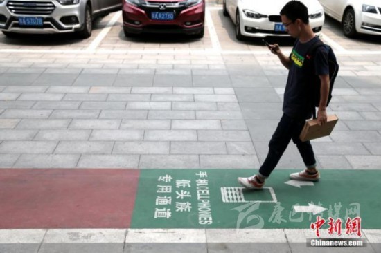資料圖:西安街頭出現(xiàn)一條專為“低頭族”設(shè)計的通道。中新社記者 張遠 攝
