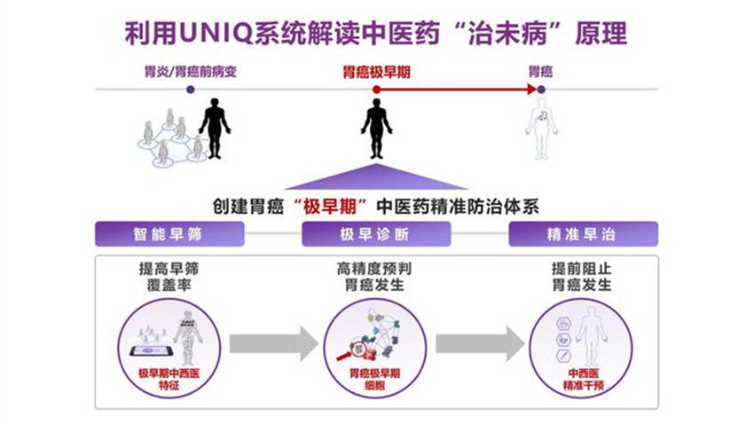 利用UNIQ系統(tǒng),結(jié)合大規(guī)模臨床病例的采集和檢測,李梢?guī)ьI(lǐng)團隊發(fā)現(xiàn)了胃癌“極早期”這一全新的階段,中醫(yī)上主要表現(xiàn)為本虛標實、寒熱失衡。從中醫(yī)典型病例中還發(fā)現(xiàn)寒、熱舌苔菌群等新型標志物,尤其是首次構(gòu)建了胃炎癌轉(zhuǎn)化的單細胞網(wǎng)絡(luò),發(fā)現(xiàn)了與胃早癌細胞高度接近的胃癌極早期細胞。經(jīng)2700余例胃炎癌轉(zhuǎn)化序貫病例樣本驗證,發(fā)現(xiàn)該標志物能夠使得胃癌發(fā)生的預判提前10個月,準確率達85%。探測出的胃癌極早期細胞如果處于萌芽期,進行中藥干預就可能延緩甚至阻斷其癌變,有望為解決我國胃癌早診率低的難題提供突破口。