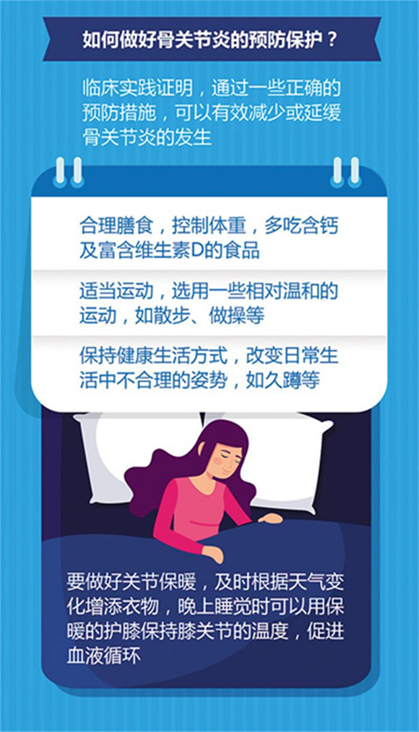 “首先是合理運(yùn)動(dòng),包括運(yùn)動(dòng)形式與節(jié)律?!彼窝蠼榻B,有患者認(rèn)為得了關(guān)節(jié)炎就不能運(yùn)動(dòng)了,實(shí)際上,不運(yùn)動(dòng)反而會(huì)導(dǎo)致肌肉萎縮和骨質(zhì)疏松,對(duì)關(guān)節(jié)不利。適量、正確的運(yùn)動(dòng),不僅不會(huì)加重軟組織的損傷或關(guān)節(jié)炎癥,還會(huì)加強(qiáng)關(guān)節(jié)的穩(wěn)定性,預(yù)防關(guān)節(jié)軟骨的進(jìn)一步損傷,減輕關(guān)節(jié)炎的癥狀,延緩關(guān)節(jié)功能退化。他強(qiáng)調(diào),要避免爬樓梯、爬山、深蹲等對(duì)關(guān)節(jié)壓力較大的活動(dòng),推薦一些中等強(qiáng)度的運(yùn)動(dòng)形式,例如散步、慢跑、游泳、騎自行車(chē)等。在運(yùn)動(dòng)節(jié)律上,推薦養(yǎng)成規(guī)律運(yùn)動(dòng)的習(xí)慣,避免“沖擊劑量”體育鍛煉,特別是步入中年后、長(zhǎng)期伏案工作的人群,一次突然的大劑量運(yùn)動(dòng)可能對(duì)關(guān)節(jié)造成嚴(yán)重的傷害。