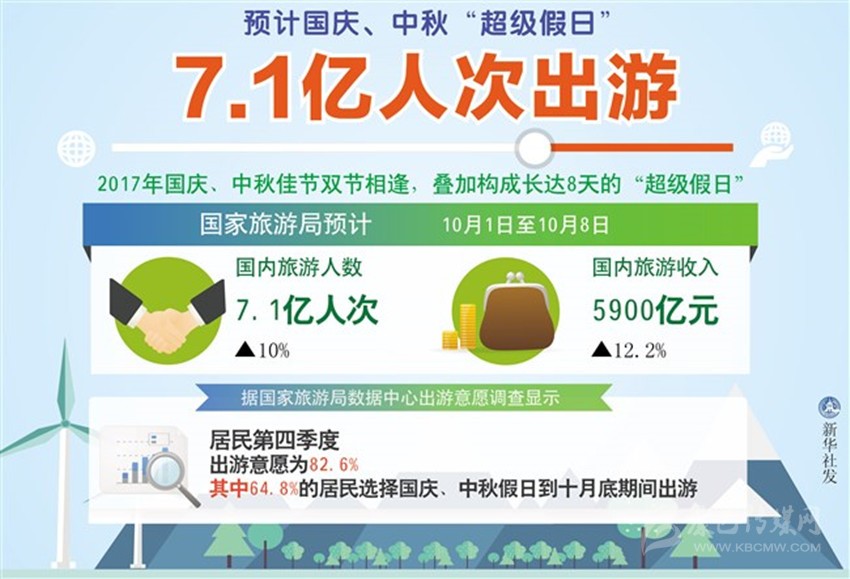 今年國慶、中秋佳節(jié)雙節(jié)相逢,疊加構(gòu)成長達(dá)8天的“超級假日”。國家旅游局預(yù)計,10月1日至8日國內(nèi)旅游人數(shù)將達(dá)到7.1億人次,國內(nèi)旅游收入將達(dá)到5900億元,較去年同期分別增長10%和12.2%。