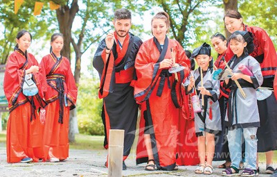 浙江省長興縣陳武帝故宮內(nèi),外國游客和學生們一起體驗投壺游戲。