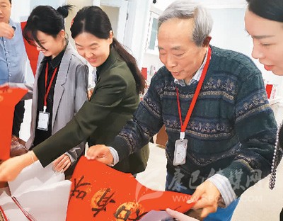 星堡香山長(zhǎng)者公寓的住戶李爺爺在展示他和朋友們一起寫的對(duì)聯(lián)。
