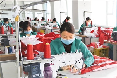 近期,甘肅省平?jīng)鍪徐o寧縣在做好疫情防控工作的同時,積極推動縣內(nèi)扶貧車間復工復產(chǎn)。截至目前,全縣57家扶貧車間已有39家恢復生產(chǎn),吸納帶動了536名貧困群眾在家門口就業(yè),增收致富。圖為靜寧縣城關(guān)鎮(zhèn)的村民在當?shù)匾患曳鲐氒囬g縫制衣服。王 毅攝(人民視覺)