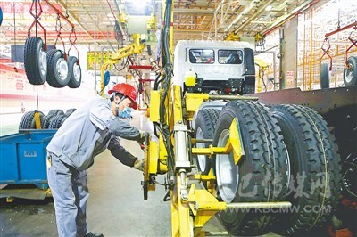 自復(fù)工以來,安徽馬鞍山市經(jīng)開區(qū)內(nèi)的華菱星馬汽車集團一手抓疫情防控,一手抓生產(chǎn)和市場,各項工作順利推進(jìn),產(chǎn)能完全恢復(fù)到疫情發(fā)生前水平。圖為工人正在安裝輪胎。