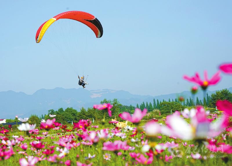 5月4日,游客在浙江省金華市武義縣大斗山飛行營(yíng)地體驗(yàn)滑翔傘?!拔逡弧毙¢L(zhǎng)假期間,許多人選擇到戶外與大自然親近。新華社發(fā)