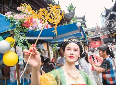 前不久,上海豫園打造的沉浸式國(guó)潮主題街區(qū)——“食玩校場(chǎng)”開(kāi)啟,國(guó)潮品牌、大牌美食、網(wǎng)紅零食、環(huán)球輕食、潮流手辦、超級(jí)IP衍生品齊聚,充滿了煙火氣。圖為一名身著漢服的女生展示可以吃的糖畫(huà)。