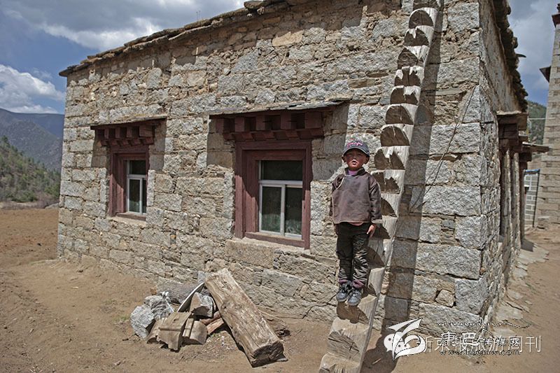 阿西村,一個小男孩在藏族地區(qū)特有的登高梯上擺姿勢照相。(攝影 陳杰)