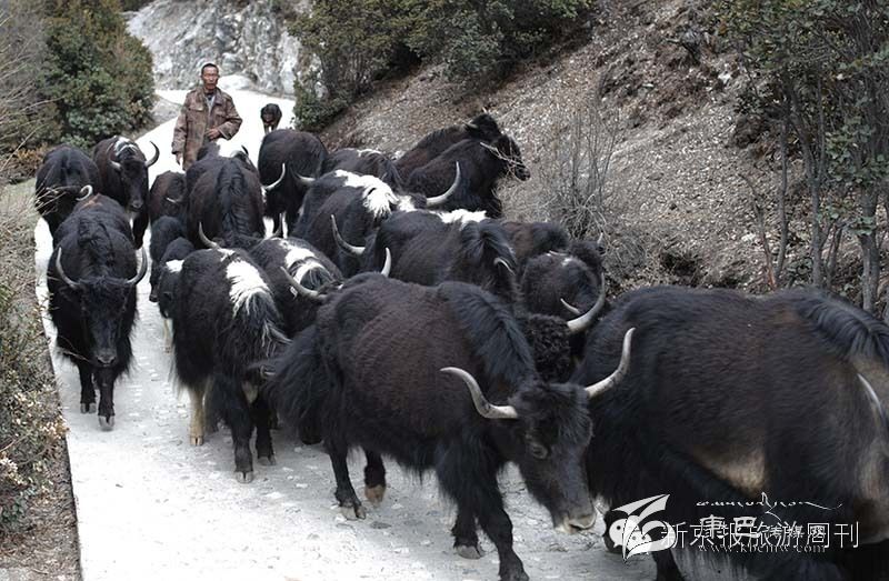 從沖古寺,我們乘坐觀光車前往洛絨牛場。這一路,我們碰到了牦牛群,放生的羊群,還有馱東西的馬幫。