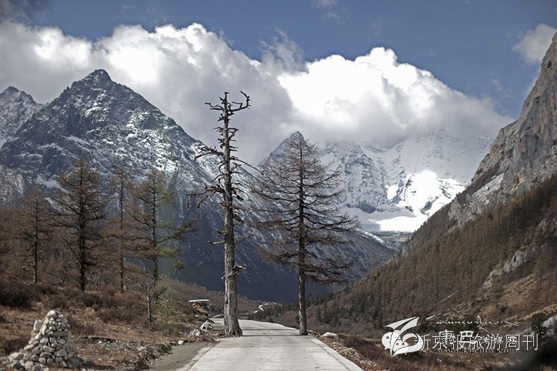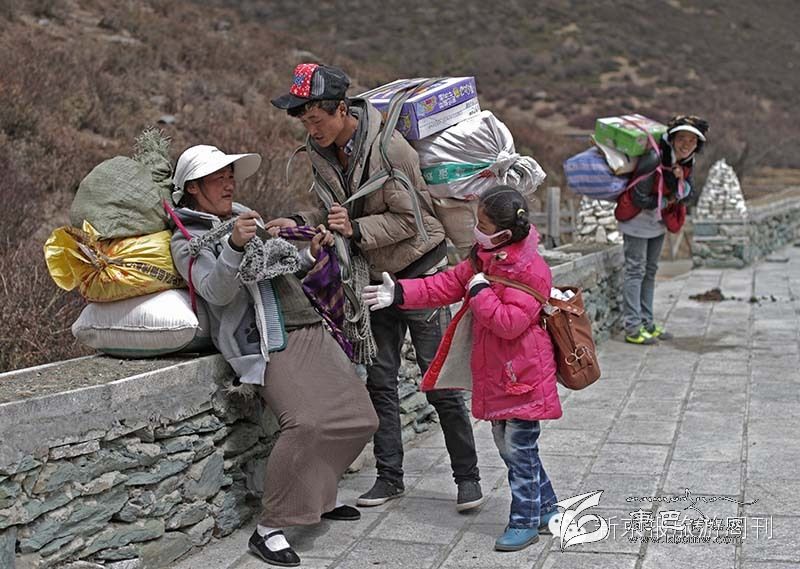 在海報4000多米的亞丁景區(qū),幾名當?shù)鼐用癖持剡_百余斤物品走五公里往牛奶河居住地。通往洛絨牛場的山路。