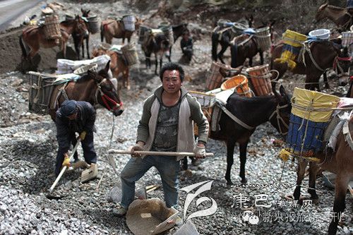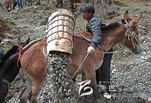 每天早上6點多,王玉海和同伴趕著騾子隊,從白玉縣縣城旁邊的住地步行約1小時到達(dá)德沙村,約8開始從離索道橋約300米的路邊沙石場裝運碎石。他們通常工作到下午5點,每只騾子在海拔3000米左右的高度,來回運送20次左右,每只騾子運輸碎石大約在3000公斤左右。這些騾子正當(dāng)強壯年,年齡大約在三四歲,通常在坡度在30度以下的,最大負(fù)重約800斤。