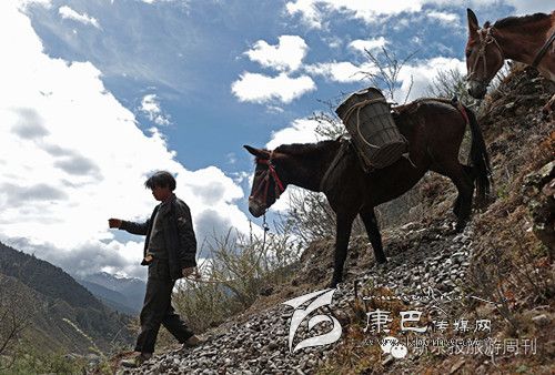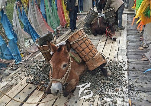 這是318和317國道都不通過的甘孜州白玉縣,從白玉縣城通往建設(shè)鄉(xiāng)德沙村的路是一條木制棧橋,2014年5月4日的中午,兩頭騾子在300斤石料的重壓下踩斷了中間的橋板,兩條前腿從踩碎的木板處懸著,騾子發(fā)出粗壯的喘息聲,無法掙扎,不能動彈。棧橋上有路過的藏民,手中旋轉(zhuǎn)著轉(zhuǎn)經(jīng)筒,他口中念念有詞:騾子啊,你還沒有得到解脫。一群來自外地的游客都很驚詫。 騾子運輸隊的王玉海,在過往行人和同行的騾隊鄉(xiāng)親的幫助下,先卸下騾子身上背負(fù)的碎石,然后手伸到騾子前腿根處,用力抬起騾子的前身。在查看騾子沒有受傷后,王玉海把這兩只騾子牽到騾隊最后面,然后,引著另外5只負(fù)重的騾子,從橋靠左邊的雙層木板橋面上通過,騾子隊受到驚嚇,不愿意上橋,王玉海安撫了一會兒騾子隊后,在同伴的協(xié)作下,前面牽引,后面驅(qū)趕,終于,王玉海的7只騾子過橋,其他8個同伴的50多頭負(fù)重的騾子也一一通過。