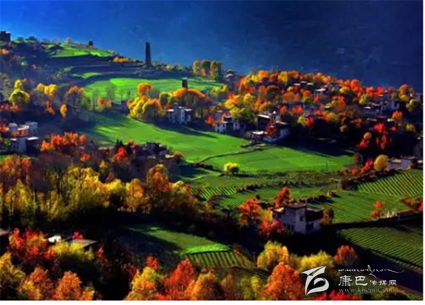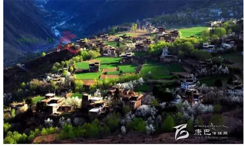 位于四川省甘孜州丹巴縣東北部,白色的藏房、金頂?shù)乃聫R還有歷史悠久的古碉樓在透藍(lán)的天空下隱約可見(jiàn),猶如置身于桃花源之中。