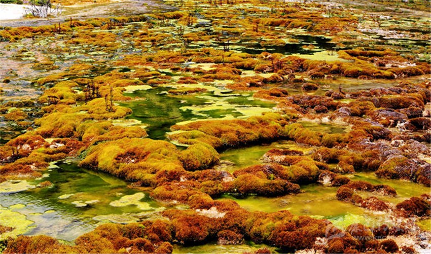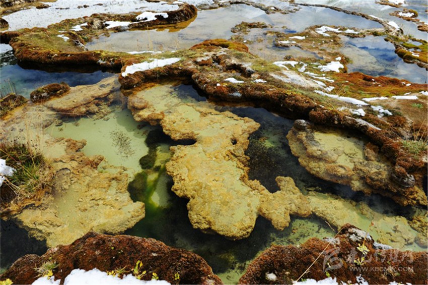 灘長約3000米,寬約200米,共有7個臺階,上面形成了大小不一的彩池,里面的各類水生植物,暢游的羌活魚(小鯢)等,給這片古老的地質(zhì)奇觀帶來了無限的生機(jī)。在海拔4300米處,有一眼噴出1.5米高的溫泉,水溫常年在30度左右,是玉龍泉華灘的主要水源。