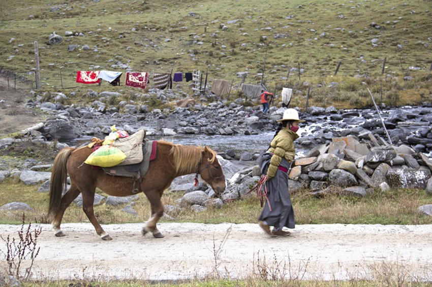 正直初秋,草坪被這個(gè)季節(jié)染成了淺褐色。草地上牦牛和馬匹成群,悠閑的啃著草地現(xiàn)存的幾抹綠意。