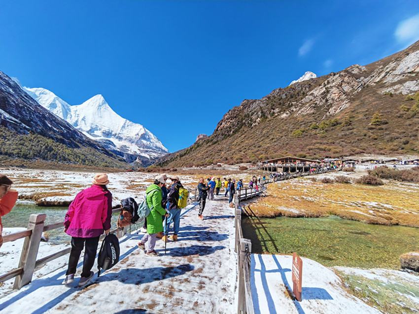 在三怙主神山、牛奶海、五色海、珍珠海、沖古寺、洛絨牧場等景點處,游客們絡繹不絕,忙著感受和記錄亞丁的初雪。