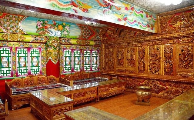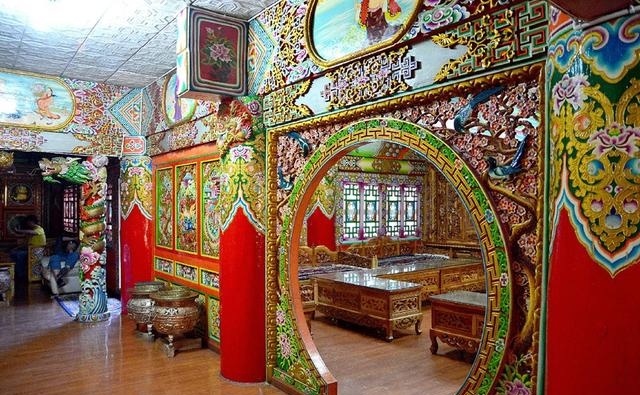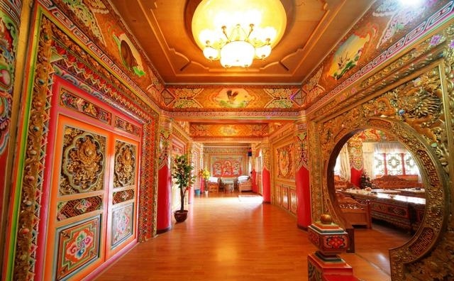 道孚民居室內(nèi)精雕細(xì)鏤,描金繪彩,每一個圖案或圖畫就是一個吉祥物或一個傳說。民居客廳陳設(shè)豪華,富麗堂皇,極顯主人的富有;經(jīng)堂供奉佛像,酥油燈長明,是家中的清靜之地;臥室多用箱式或椅式藏床,陳設(shè)溫馨而別具風(fēng)情。