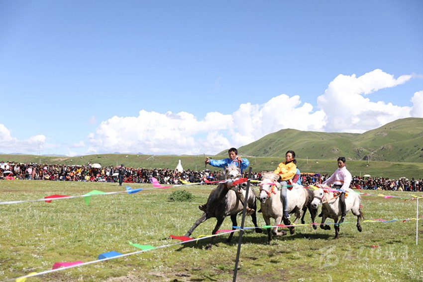 馬尼干戈鎮(zhèn)全境橫貫國道317線,是德格典型的純牧業(yè)鄉(xiāng)鎮(zhèn),轄區(qū)內(nèi)地廣人稀,草場豐富,有著十分豐富的牧俗文化,“西天瑤池”玉隆拉措也坐落于此。每年的7月底8月初舉行的賽馬節(jié),是當?shù)刈顬槁≈氐膫鹘y(tǒng)民族節(jié)日之一。在雪域高原上綠草如茵、各類鮮花爭相斗艷的最美時節(jié),牧民們會身著華麗的藏裝,自發(fā)聚集在一片開闊的草場上,搭帳篷、唱歌跳舞,并開展賽馬、賽牦牛、賽跑和馬技表演、趣味游戲等民俗民間活動,增進相互之間的感情,促進鄰里和睦。