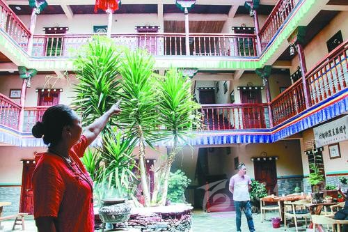 記者在“安卡兒民族莊園”看到,每天游客絡(luò)繹不絕,游客們不肯錯(cuò)過的是這里的鄉(xiāng)愁。眼前的“安卡兒民族莊園”是一座藏式三層小樓,以嘉絨民居為主格調(diào)。從外觀看,這棟三層小樓與村里其他農(nóng)家小院沒有多少差異,但仔細(xì)端詳,其所有窗戶大小、高低不一,透出與眾不同的設(shè)計(jì)風(fēng)格。走進(jìn)院內(nèi),這座藏式小樓的走廊外側(cè)裝著木欄桿,欄桿下面掛著藍(lán)綠相間的布條,以及大院中央郁郁蒼蒼的盆景,讓人美不勝收。