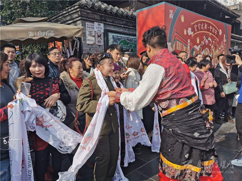快閃還未開(kāi)始,20名身著少數(shù)民族服裝的藏族姑娘小伙,便成為了一道最獨(dú)特、亮麗的風(fēng)景線(xiàn)。隨后,他們給游客們帶來(lái)了獨(dú)具甘孜特色的歌舞《康定情歌》《甘孜踢踏》,悠揚(yáng)的歌聲、奔放的舞步,讓圣潔甘孜大美天成的獨(dú)特風(fēng)韻完美展顯,吸引了春熙路如潮的人群,被歌舞魅力感染,不少市民隨著他們一起唱跳了起來(lái)。而此時(shí)的成都寬窄巷子里,也正在演繹著一場(chǎng)震撼的“快閃”,四名穿著格薩爾王服飾的大將,身披鎧甲、手持刀劍,格外威武帥氣,市民和游客紛紛拿出手機(jī)拍照留念?!翱扉W”結(jié)束后,熱情的甘孜兒女為周邊的觀(guān)眾獻(xiàn)上潔白的哈達(dá),向他們致以美好的祝福,并誠(chéng)摯歡迎他們到甘孜旅游。