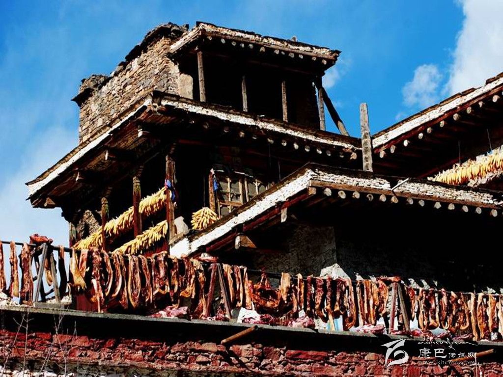 嘉絨藏族年到來(lái)之前幾天,丹巴藏寨格外耀眼美麗。寨房的主人們都依照傳統(tǒng)習(xí)俗,以當(dāng)?shù)氐?ldquo;白泥巴”為主要原料,通過(guò)配方煎制成白色染料,精心涂染寨樓墻面,并用白灰在墻面上繪畫(huà)出天、地、日、月、星和各種動(dòng)物圖案和宗教圖案,使整個(gè)藏寨披上潔白的盛裝。每年冬月12日就到了嘉絨藏族年大年三十,這天,山寨家家戶(hù)戶(hù)面滿(mǎn)柜、酒滿(mǎn)壇、水滿(mǎn)缸、柴滿(mǎn)棚,歡歡喜喜過(guò)迎新年;宰殺肥豬腌制香豬腿、制作豬膘,擺上酒席、跳上鍋莊祝福新年。