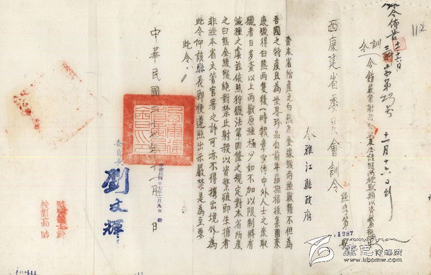 民國(guó)27年(公元1938年),“西康省建省委員會(huì)”發(fā)出“經(jīng)字第1287號(hào)”訓(xùn)令,這是一份難能可貴的保護(hù)野生動(dòng)物的訓(xùn)令,訓(xùn)令說(shuō):“查本省所產(chǎn)之白熊及金線(xiàn)猴兩種獸類(lèi),不但為吾國(guó)之特產(chǎn),且為世界珍品。自前年羅斯福采集團(tuán)來(lái)康獵得白熊兩只后,一時(shí)報(bào)章宣傳,中外人士之來(lái)取獵者日多。查以上兩獸原種極少,如不加以限制,將有滅種之虞。茲依照狩獵法第四條之規(guī)定,對(duì)本省所產(chǎn)之白熊、金線(xiàn)猴絕對(duì)禁止射殺,以資繁殖。即生捕者非經(jīng)本省主管官署之許可,不得帶出境外。為此令仰該縣長(zhǎng)即便遵照出示嚴(yán)禁是為至要,此令。”訓(xùn)令最后署有“西康建省委員會(huì)委員長(zhǎng)劉文輝”的簽名。