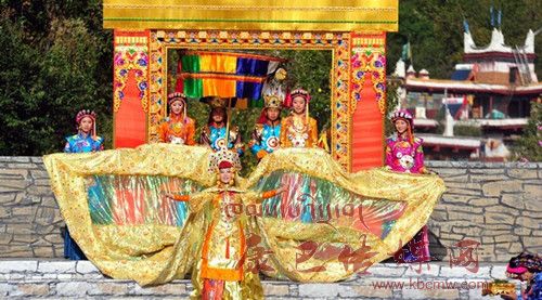 在催人奮進(jìn)的戰(zhàn)鼓聲中,一群身披甲胄的士兵拿著長劍,背著巨弓走到臺前,在鏗鏘的戰(zhàn)鼓聲中,戰(zhàn)士們做著各種競技動作,模仿武士們互相攻擊的樣子,那矯健的身影展示了遠(yuǎn)古時代嘉絨藏族先民們?yōu)榱松媾c自然努力抗?fàn)幍膱鼍?。過了一會兒音樂一轉(zhuǎn),戰(zhàn)鼓聲漸漸減弱,在鳥雀的陣陣啾啾聲中,一座木門慢慢的開啟,一位身披長袍、頭戴鳳冠的女王在眾多美女的簇?fù)硐拢従徸呦屡_階步入舞臺中央,此時,一位手捧托盤的老者來到女王面前單膝下跪,將托盤高舉過頂,并邀請女王品嘗佳肴,女王將中指在酒中蘸了蘸,并曲起中指向四周輕輕彈去,寓意愿將杯中美酒與四方百姓同飲。在女王面前還放置著一個凈水桶,桶中盛滿了清澈的甘泉,桶上橫放著一枝柏樹枝,女王伸出纖纖玉手,拿著柏樹枝在水中蘸了蘸,面向墨爾多神山撒去,寓意向神山祈福。這是此次《美人谷·丹巴》節(jié)目展演中的序曲部分,有著強烈的東女神韻,將遠(yuǎn)古時代東女國女王遺風(fēng)展演的淋漓盡致。
