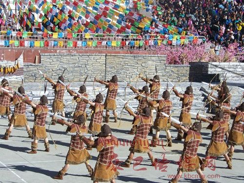 10月26日,在甲居藏寨,處處洋溢著豐收和歡樂的氣氛,人們扶老攜幼,身著節(jié)日的盛裝走到一起,來共同慶祝丹巴嘉絨風(fēng)情節(jié)的順利召開。在一塊空地中,搭建了臨時的舞臺,看臺上,幾座古碉模型傲然挺立,在不遠(yuǎn)處,一座古碉矗立在一座小山包上,與古碉模型遙相呼應(yīng)、相映成趣。上午9時40分,當(dāng)節(jié)目主持人宣布嘉絨風(fēng)情節(jié)正式開始時,一束束搖曳的煙花向空中飛去,在空中炸響后,散發(fā)出五顏六色的煙霧,其中有的還幻化成幾多小小的降落傘,就像多多盛開的鮮花在空中綻放。演出現(xiàn)場前的大地和遠(yuǎn)處的小山坡上到處都站滿了熱情的觀眾,合著禮花的爆裂時的響聲,將手中的小紅旗展開,高舉過頭頂,有節(jié)奏的左右搖動,霎時間,整個現(xiàn)場成為了紅色的海洋。