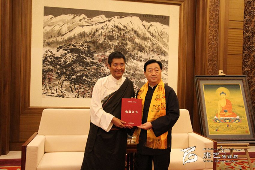 產(chǎn)業(yè)化發(fā)展的探索之路,不僅圓了年敘·多吉頓珠的“文化產(chǎn)業(yè)夢(mèng)”,而且也讓他實(shí)現(xiàn)了一次華麗轉(zhuǎn)身,成為一名有擔(dān)當(dāng)?shù)钠髽I(yè)家。今年9月5日至15日,由中華文化發(fā)展促進(jìn)會(huì)、西藏自治區(qū)文化廳、西藏自治區(qū)文學(xué)藝術(shù)界聯(lián)合會(huì)、西藏自治區(qū)文化產(chǎn)業(yè)協(xié)會(huì)主辦,西藏崗地文化產(chǎn)業(yè)集團(tuán)、西藏拉姆拉綽唐卡畫(huà)院承辦的“西藏唐卡藝術(shù)——多吉頓珠、丁噶唐卡作品展“在北京中國(guó)國(guó)家博物館舉行。他和丁嘎先生現(xiàn)場(chǎng)向國(guó)家博物館捐贈(zèng)了《釋迦牟尼》、《五方度母》、《綠度母》和《觀(guān)音》四幅精品,這是國(guó)家博物館首次收藏多派唐卡和嘎瑪嘎智畫(huà)派唐卡,填補(bǔ)了國(guó)家博物館館藏嘎瑪嘎止畫(huà)派和多派唐卡的空白。國(guó)家博物館館長(zhǎng)呂章申先生熱情為兩位大師頒發(fā)了收藏證書(shū)并激動(dòng)地說(shuō):“多吉頓珠先生和丁嘎先生捐贈(zèng)的精品力作,豐富了中國(guó)國(guó)家博物館的館藏,更好地弘揚(yáng)了西藏文化藝術(shù)。國(guó)家博物館有責(zé)任把最好的藝術(shù)品收藏起來(lái),留存于后世。”