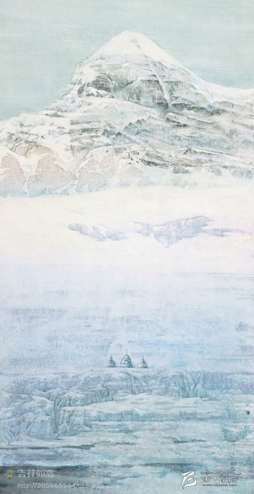 最后創(chuàng)作出了這張作品:神圣的岡仁波齊,您是世界中心;巍巍頂上是幾千年來,帝釋天的居所;山下積雪皚皚,在滿是瑪尼的巖壁下,是象征佛、法、僧的三座石塔,又宛如你忠實的信徒正在對你娓娓述說、虔誠祈禱。時間的河流,正在您腳下寂靜、流逝、封凍。