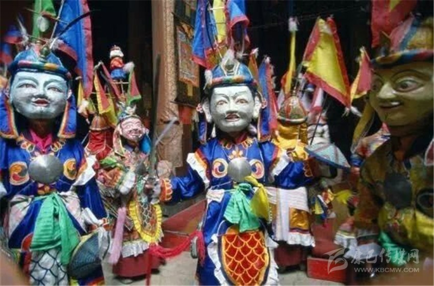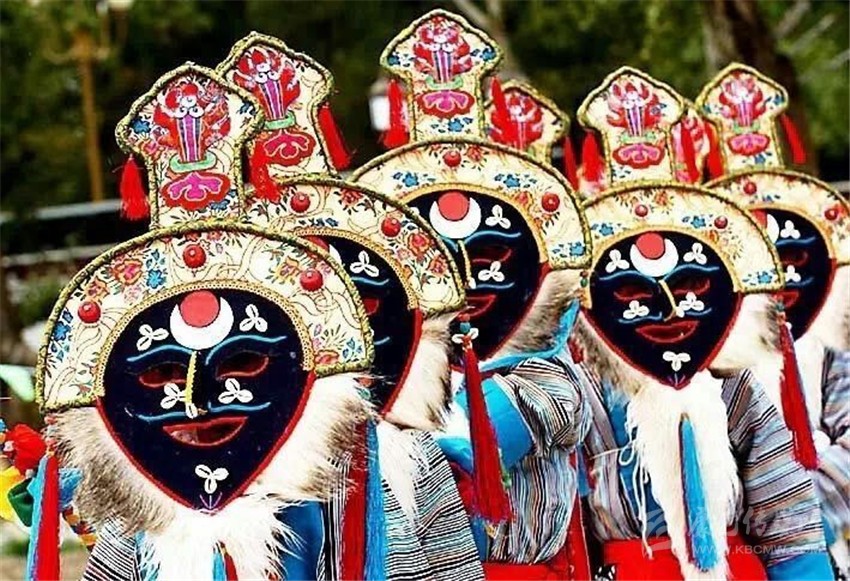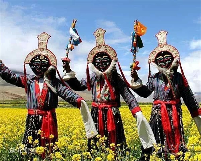 第三部分,被稱為“扎西學(xué)”。頭戴白羊皮面具,面部呈黃色的演員們是吉祥老人的化身。他們雖然老態(tài)龍鐘,但動作卻輕盈無比。其裝束除了腰間纏繞的“子體”未掛五色彩綢外,與“溫巴”別無二致。他們在歡樂的舞動,向眾人賜福吉祥。