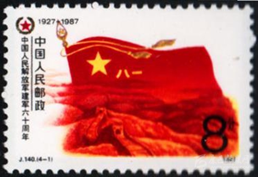 1977年8月1日原郵電部發(fā)行的《中國人民解放軍建軍50周年》紀(jì)念郵票,其中第4枚“雄師過大江”,圖案中一名沖在渡江隊伍前面的戰(zhàn)士高舉一面“八一”軍旗。1987年8月1日原郵電部發(fā)行的《中國人民解放軍建軍60周年》紀(jì)念郵票一套4枚。其中第1枚“軍魂”,郵票上一面鮮紅的“八一”軍旗迎風(fēng)飄揚,旗下是蜿蜒的萬里長城,代表了中國人民解放軍是保衛(wèi)祖國和人民的“鋼鐵長城”。1995年8月1日,原郵電部試發(fā)行一套“義務(wù)兵專用”郵票一套1枚,票名為“神圣的使命”,圖案以紅光四射的“八一”軍旗為背景,以現(xiàn)代化的飛機、坦克、火箭和象征和平的白鴿為襯托,畫面是威武的陸??杖?,顯示我軍鋼鐵長城般攻無不克、戰(zhàn)無不勝的精神風(fēng)貌。