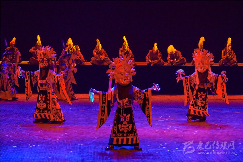 《亞丁?三怙主》歌舞劇不僅從藏族人民日常生產(chǎn)生活中提煉出很多舞蹈文化元素,還對(duì)宗教樂(lè)舞進(jìn)行了合理的借鑒。舞劇中用了道孚嘛呢鍋莊、德格卓且、巴塘弦子、爐霍鍋莊、石渠真達(dá)鍋莊、丹巴鍋莊、稻城鍋莊等民間舞蹈等元素,加以深化再創(chuàng)作,把原有的民間舞蹈的步伐、舞姿進(jìn)行夸張性的舞臺(tái)處理,并配以適當(dāng)?shù)年?duì)形,以更加適應(yīng)劇場(chǎng)舞臺(tái)的表演;大膽創(chuàng)新引入寺廟樂(lè)舞,寺廟樂(lè)舞本是藏傳佛教寺廟在宗教節(jié)日表演的祈福性舞蹈,舞劇編創(chuàng)人員合理借用寺廟樂(lè)舞的音樂(lè)、步伐、面具等,用以表現(xiàn)藏族人民與自然抗?fàn)?,不懼不屈的精神面貌;用泥土筑墻本是藏族人民建造房屋時(shí)的一種建筑技藝,在民間演繹成為地方舞種,舞劇編創(chuàng)人員將筑墻的基本步伐和動(dòng)作加以提煉,編創(chuàng)了一段約兩分鐘的打舞,用夸張的步伐和動(dòng)作,配以鏗鏘有力的勞動(dòng)號(hào)子,將豪氣灑脫的打墻舞氣氛推向高潮,以表達(dá)藏族人民的勤勞、勇敢與豪邁。州委黨校高級(jí)講師陶勇說(shuō):“《亞丁?三怙主》歌舞劇旨在講解香格里拉之魂,詮釋亞丁三怙主的本意,闡釋三座神山文化包含佛陀的核心教義。亞丁三怙主即仙乃日(觀世音菩薩)、央邁勇(文殊菩薩)、夏諾多吉(金剛手菩薩),它們分別象征慈悲、智慧、力量。這部歌舞劇是解讀藏民族精神文化、弘揚(yáng)藏民族真善美勇、傳遞康巴文化真諦的民族歌舞劇。歌舞劇通過(guò)《序》、《慈明》、《慧明》、《力明》、《尾聲》五個(gè)篇章,充分展示藏族傳統(tǒng)文化中熱情、好客、善良、慈悲、勇敢、追求和諧的優(yōu)秀價(jià)值觀,將民族文化融入到社會(huì)主義核心價(jià)值觀,展現(xiàn)了當(dāng)代人民群眾的幸福生活。同時(shí)對(duì)游客來(lái)講不僅豐富了亞丁文化,填補(bǔ)了游人僅僅觀賞雪山不知文化內(nèi)涵的短板,為以后推介甘孜州做了很好的示范?!?/span>