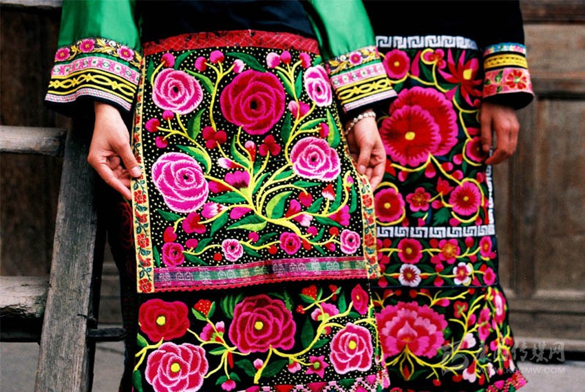 平常,魚通女性身著青布長(zhǎng)衫,頭頂同色系列的帕子。節(jié)日盛裝時(shí),以青藍(lán)長(zhǎng)衫打底,并配以繡有花朵圖案的圍裙和頭帕。經(jīng)過(guò)這樣的點(diǎn)綴,女性的柔美與嫵媚被展示得恰到好處。然而,這些作品所被賦予的,并不僅僅是勻稱的力道,細(xì)密的針腳,以及大膽的配色,同樣,也摻雜著與之息息相關(guān)的生活,穿梭在流水般的日子當(dāng)中,每一針每一線都被細(xì)細(xì)打磨,長(zhǎng)期勞動(dòng),真實(shí)面目逐漸呈現(xiàn)。這些作品,在歲月的磨礪中被糅合,經(jīng)得住任何挑剔的品味。
