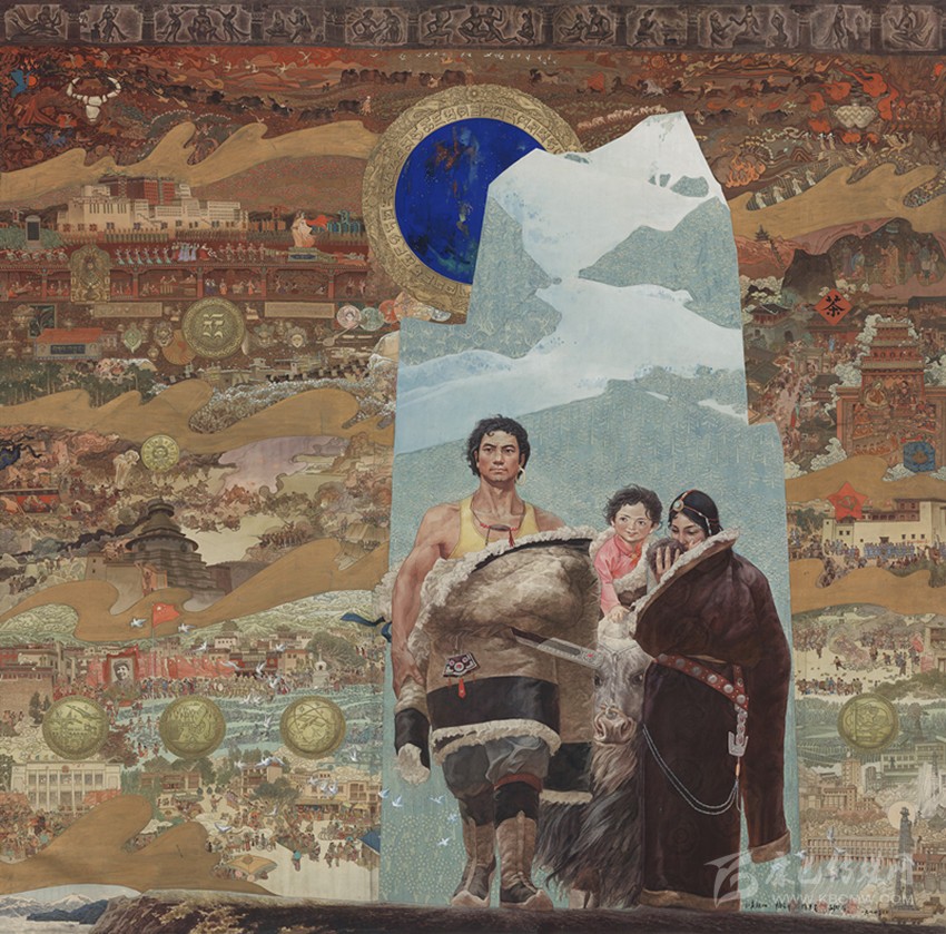 15世紀以來,唐卡發(fā)展所恒定的兩個元素:一是平面構(gòu)圖的神佛之境,另一則是吸收大青綠山水精髓。正如DNA鏈的雙螺旋結(jié)構(gòu)一般,使唐卡繪畫在歷史時空中穿插縈繞,在雪域各地生根開花。到了公元20世紀初,照片的高度寫實促使藏地畫家邁出了革新步伐,使得唐卡繪畫逐漸擺脫傳統(tǒng)束縛,開啟了“人”的覺醒。衛(wèi)藏地區(qū)出現(xiàn)了“根敦群培、安多強巴”引入寫實主義的嘗試,成為當今西藏“布面重彩”的先驅(qū)。新中國成立后,內(nèi)地的美術(shù)創(chuàng)作積極影響了三大藏區(qū)的繪畫發(fā)展,上世紀80年代,四川康區(qū)“甘孜藏畫”肇起,在《嶺·格薩爾王》人文主義的召喚下,《雪山兒女》《唐東杰布》《新概念唐卡》正從歷史深處一路走來。而近年來,安多藏區(qū)則創(chuàng)新出了“藏族祥巴版畫”,祥巴版畫不僅是從材料技法上對西藏繪畫的豐富,更是藏地畫家們在自覺不自覺的求新、求變;甚至在傳統(tǒng)唐卡領(lǐng)域,民間畫師也都在紛紛嘗試將傳統(tǒng)唐卡和現(xiàn)代審美相結(jié)合。這一切,正是唐卡繪畫從傳統(tǒng)走向現(xiàn)代、由宗教博衍至生活的演變過程,在這個過程里,藏地畫家不僅在畫面的形式和語言上完成了傳統(tǒng)與當代的統(tǒng)一,還將西藏的審美特質(zhì)虹化為作品的精神內(nèi)核。這也是唐卡藝術(shù)第二次“從香巴拉到人間”的過程,成為民族文化發(fā)展的新坐標。